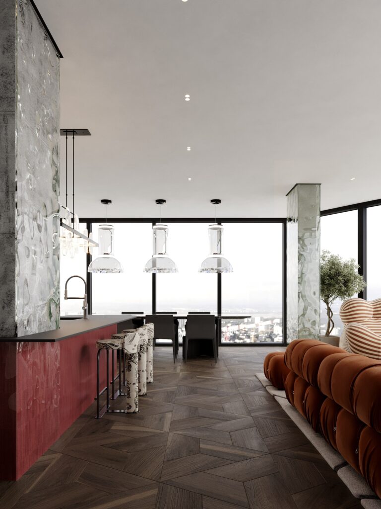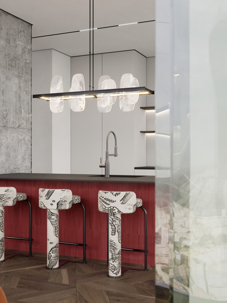 Serce apartamentu stanowi kuchnia z wyspą w kolorze intensywnej czerwieni. Hokery o unikatowym wzornictwie oraz elegancka zabudowa kuchenna w odcieniach bieli i szarości nadają wnętrzu niepowtarzalny charakter. Subtelne oświetlenie i nowoczesne rozwiązania technologiczne sprawiają, że to nie tylko przestrzeń do gotowania, ale także reprezentacyjny punkt spotkań.