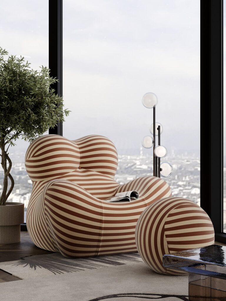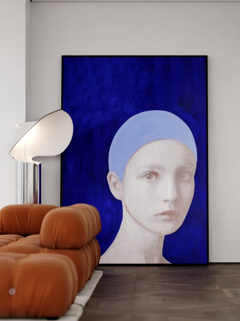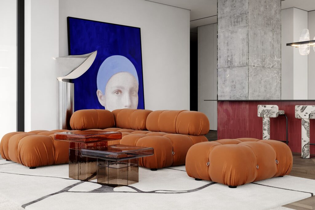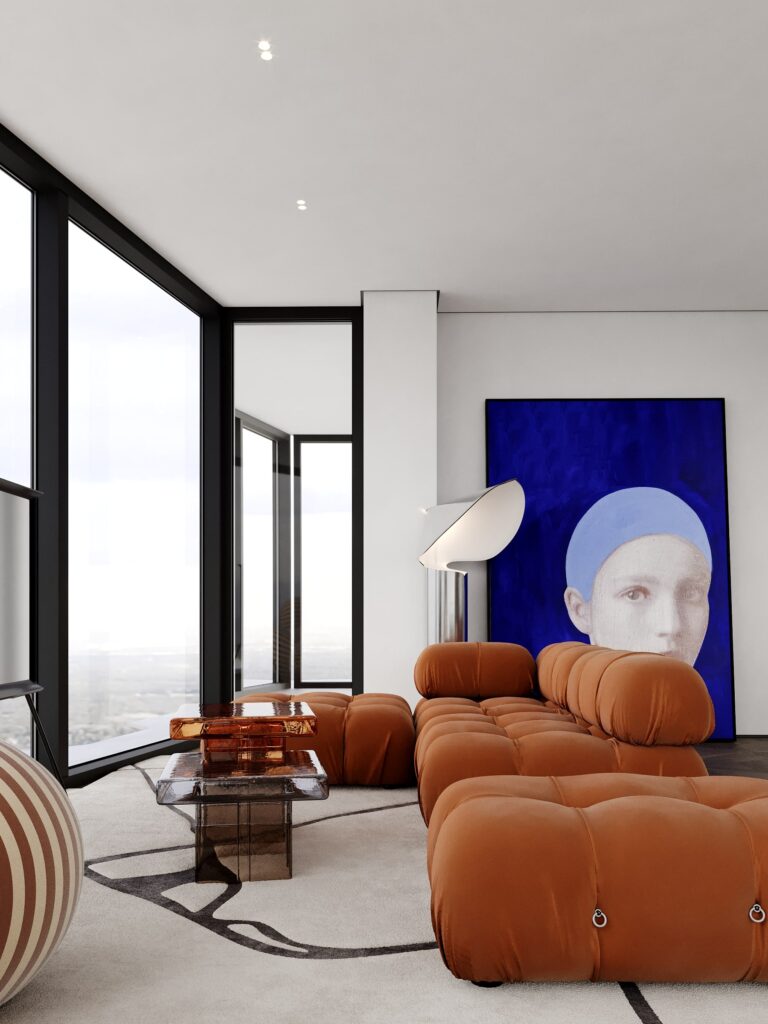 Salon urządzono z myślą o osobach ceniących odważny design i maksymalny komfort. Modułowa sofa o miękkiej formie w odcieniu ciepłej cegły, w połączeniu z designerskimi stolikami i wyrazistym obrazem o intensywnie kobaltowym tle, tworzą nowoczesny klimat. Całość podkreślają panoramiczne okna, które zapewniają spektakularny widok na Warszawę.