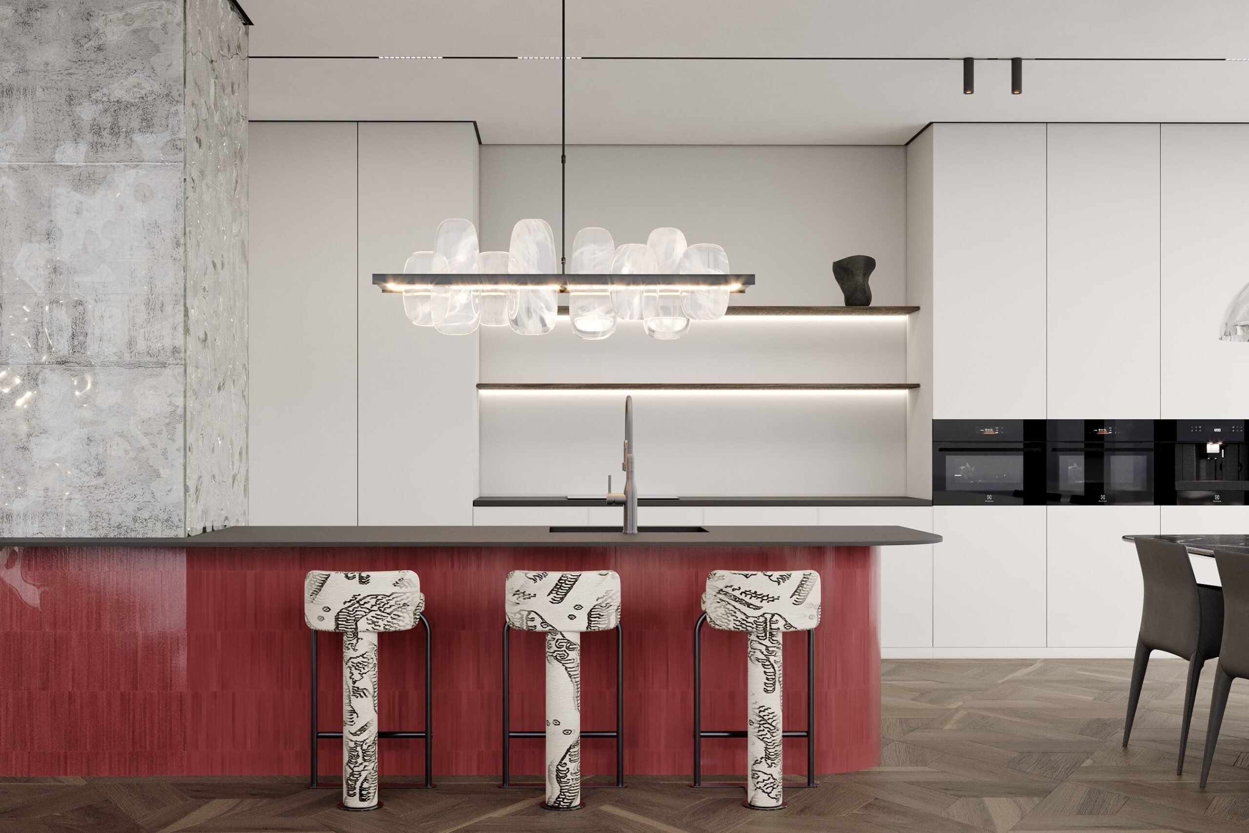 Serce apartamentu stanowi kuchnia z wyspą w kolorze intensywnej czerwieni. Hokery o unikatowym wzornictwie oraz elegancka zabudowa kuchenna w odcieniach bieli i szarości nadają wnętrzu niepowtarzalny charakter. Subtelne oświetlenie i nowoczesne rozwiązania technologiczne sprawiają, że to nie tylko przestrzeń do gotowania, ale także reprezentacyjny punkt spotkań.