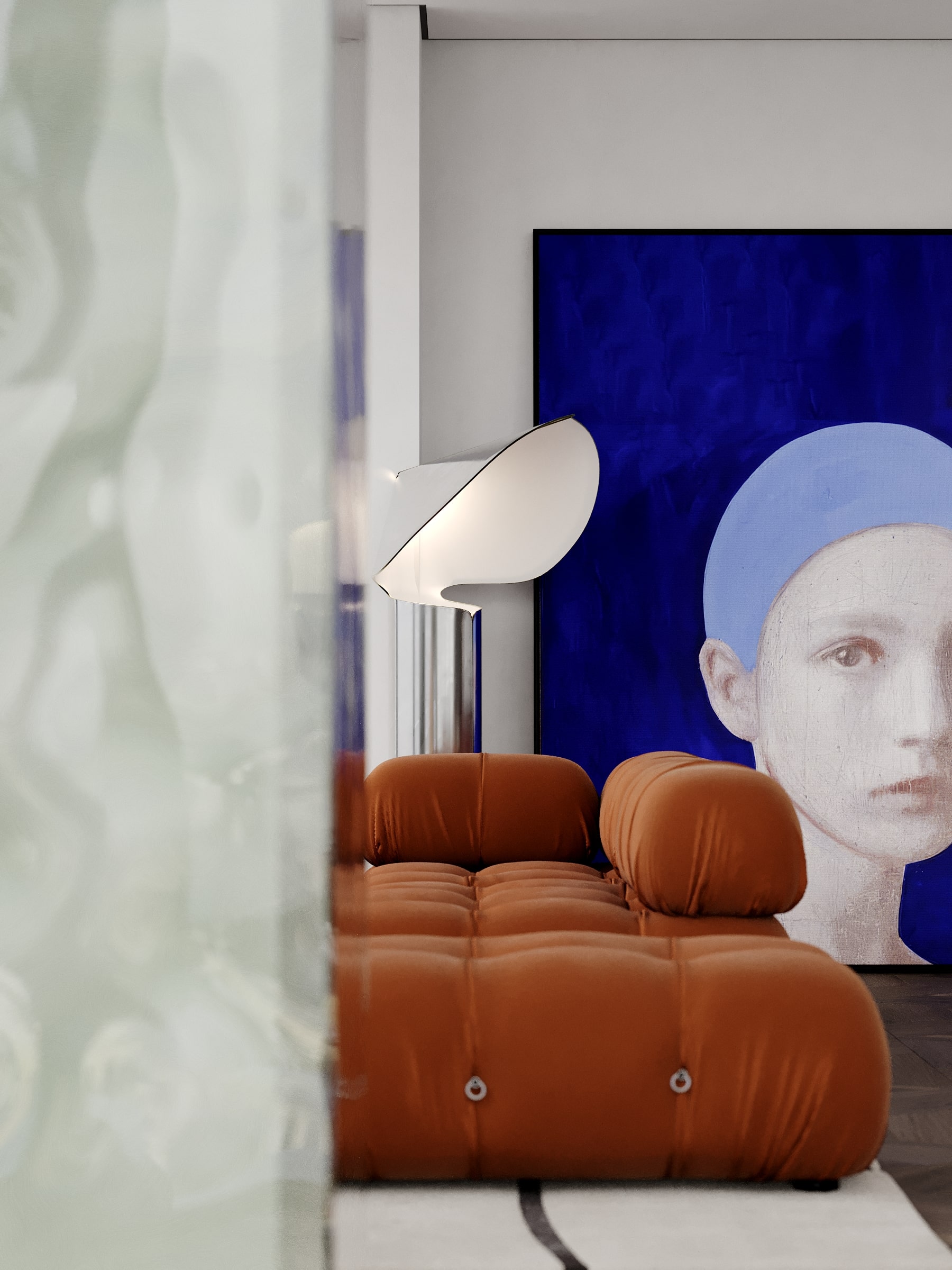 Salon urządzono z myślą o osobach ceniących odważny design i maksymalny komfort. Modułowa sofa o miękkiej formie w odcieniu ciepłej cegły, w połączeniu z designerskimi stolikami i wyrazistym obrazem o intensywnie kobaltowym tle, tworzą nowoczesny klimat. Całość podkreślają panoramiczne okna, które zapewniają spektakularny widok na Warszawę.