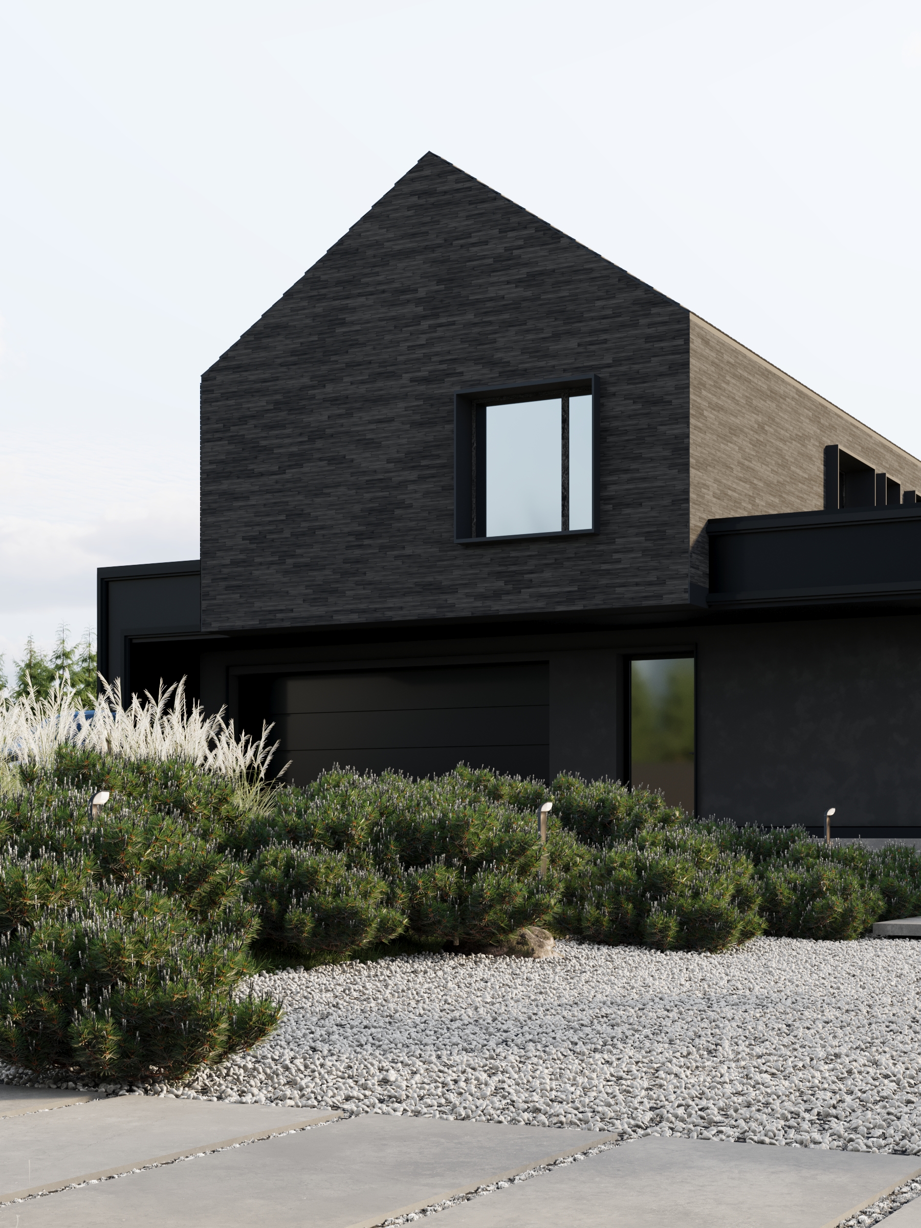Budynek, którego ogród otacza, to przykład nowoczesnej, surowej elegancji. Elewacja pokryta czarną cegłą klinkierową łączy trwałość z wyrazistością i nadaje bryle głęboki, szlachetny charakter. Czarny kolor tynku zastosowany na pozostałych fragmentach ścian podkreśla minimalistyczną formę i spójność projektu.