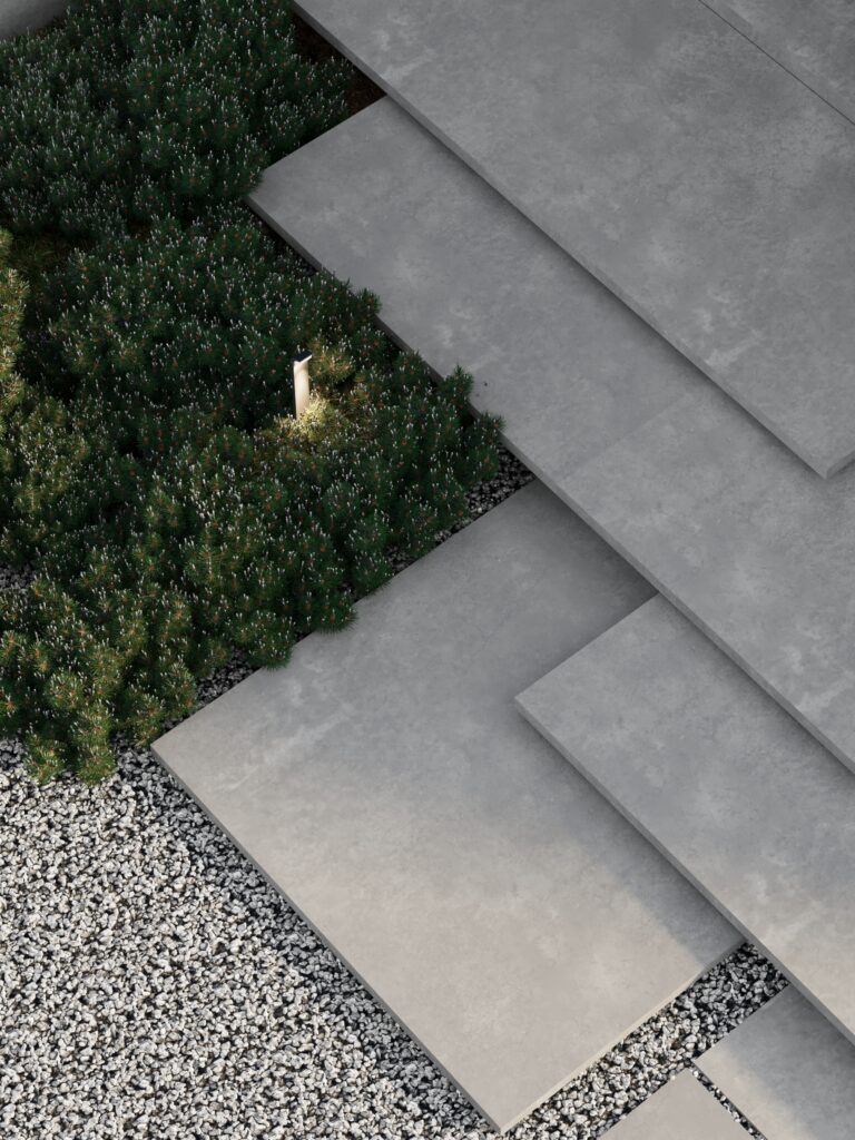 Zamiast klasycznego trawnika, w projekcie wykorzystano kamień dekoracyjny — jasny i grafitowy żwir — który kontrastuje z roślinnością, podkreślając jej architektoniczną formę. Ścieżki i nawierzchnie wykonano z szerokich betonowych płyt, ułożonych w sposób rytmiczny, co nadaje przestrzeni wrażenie lekkości i porządku. Betonowe płyty płynnie przechodzą w taras wypoczynkowy, stanowiący strefę relaksu wśród zieleni.